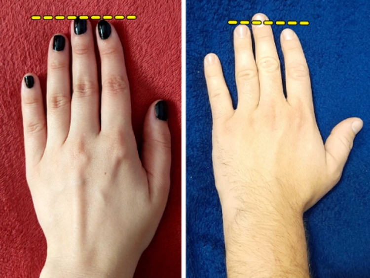 Gjatësia e gishtave: Në përgjithësi, tek gratë gishti tregues është më i gjatë se gishti i unazës. E kundërta ndodh tek meshkujt, ku gishti i unazës është më i gjatë se ai treguesi. Ky fakt është i shpjeguar edhe prej shkencës, pasi tek meshkujt testosteroni ndikon në rritjen e gishtit të unazës.