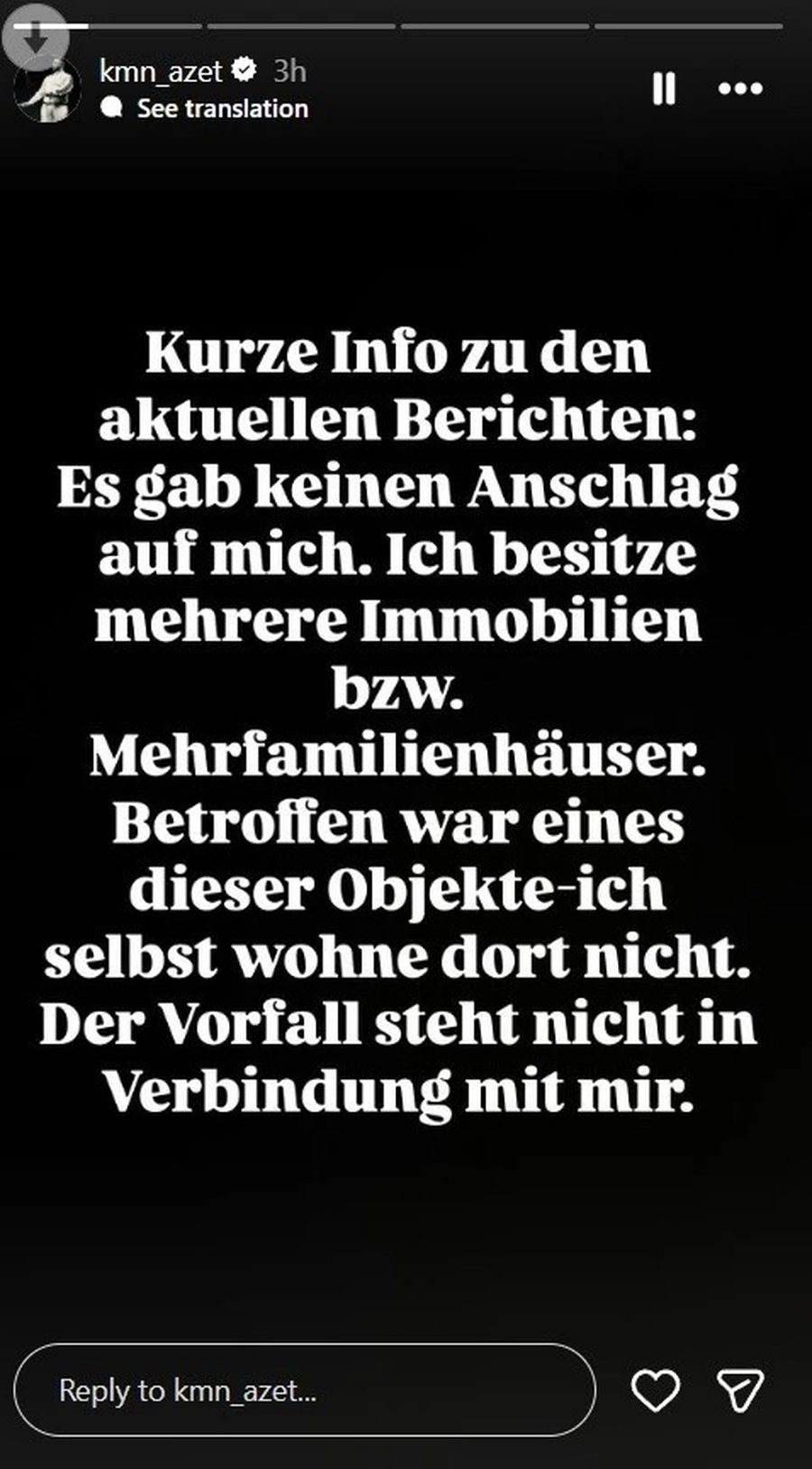 Reperi shqiptar me banim në Gjermani, Azet, ka reaguar në lidhje me shpërthimin me tritol që ndodhi një ditë më parë në hyrje të një apartamenti në pronësi të tij në Gjermani. Përmes një postimi në rrjetet sociale, ai është shprehur se sulmi nuk ka patur lidhje me të.