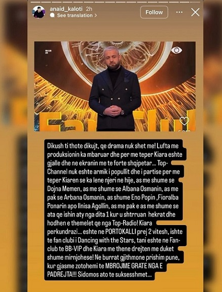 Kiara perkundrazi... eshte ne PORTOKALLI prej 2 vitesh, ishte te fan clubi i Dancing ëith the Stars, tani eshte ne Fan-club te BB-VIP dhe Kiara me thene drejten me duket shume mirnjohese! Ne burrat gjithmone prishim pune, kur gjasme zotohemi te MBROJME GRATE NGA E PADREJTA!!! Sidomos ato te suksesshmet...”, shkruante Anaidi në reagimin e tij në Instagram, ndërsa i menjëhershëm ka qenë dhe postimi i Luizit.