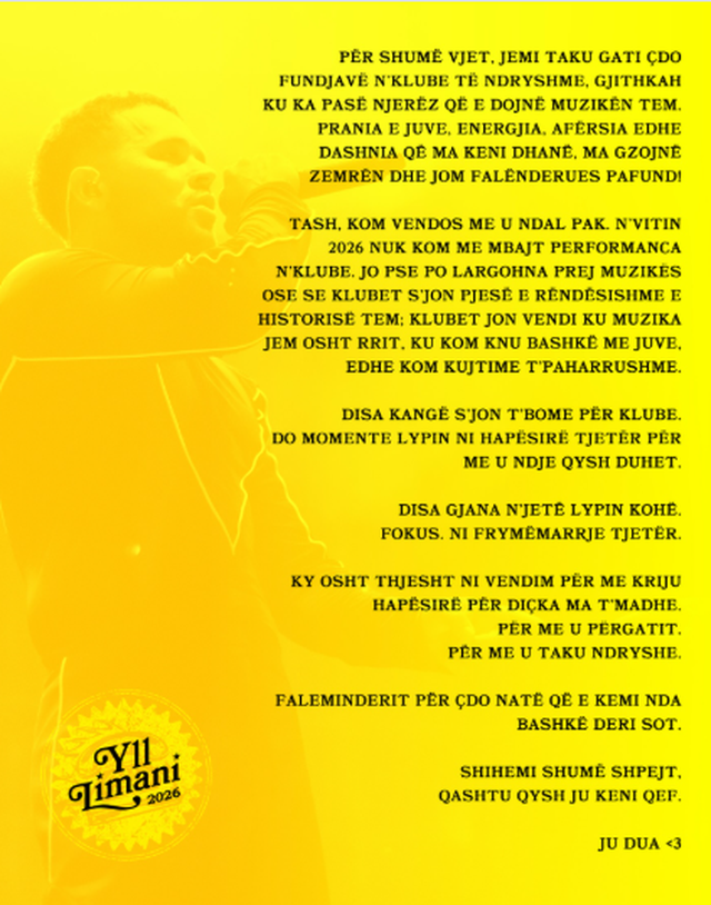 Yll Limani ka surprizuar publikun me një njoftim të drejtpërdrejtë dhe emocional: në vitin 2026 ai nuk do të mbajë performanca në klube, duke vendosur kështu një pauzë nga një format që ka shoqëruar për vite me radhë rrugëtimin e tij muzikor.