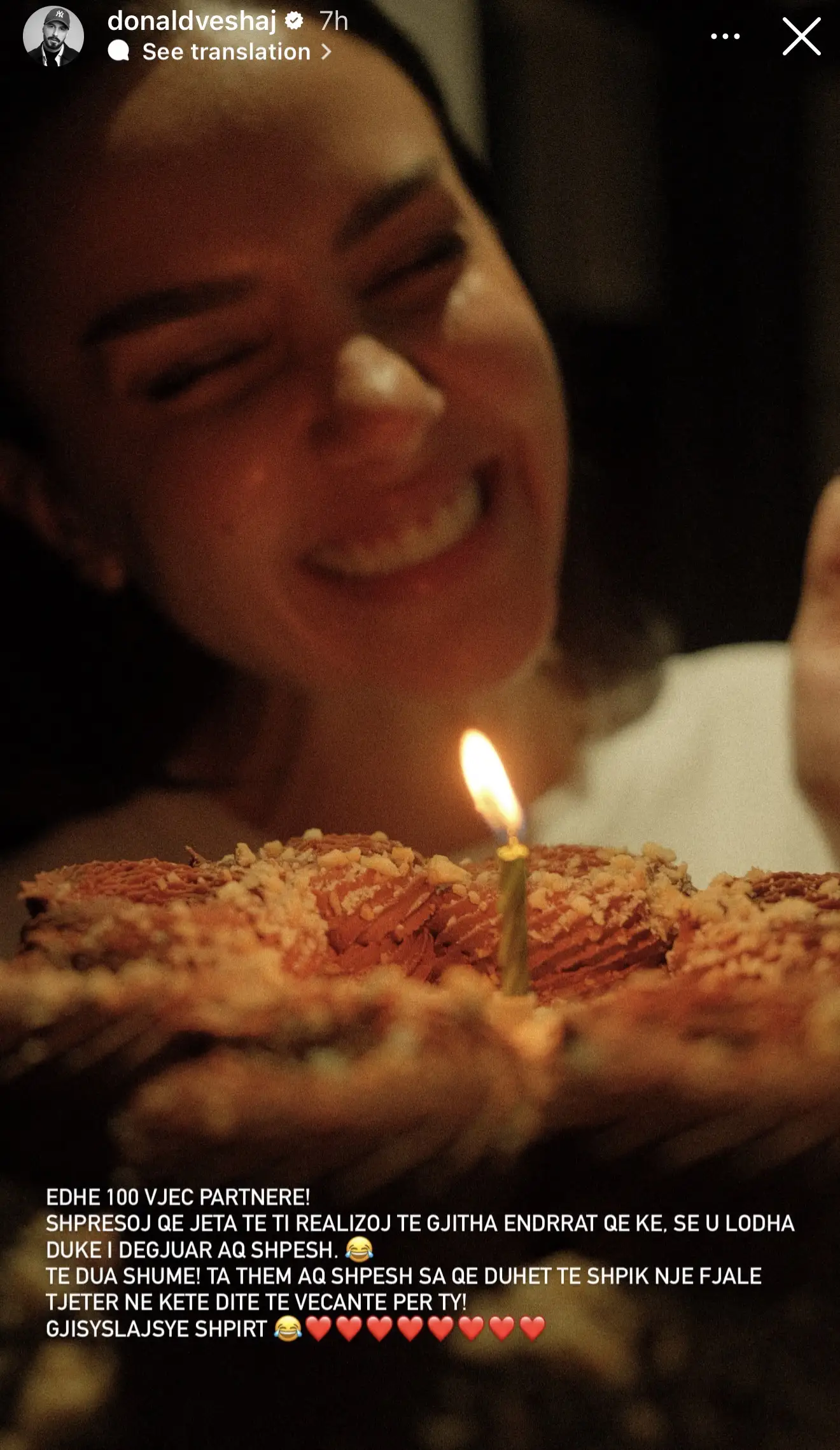 "Edhe 100 vjeç partnere! Shpresoj që jeta të t’i realizojë të gjitha ëndrrat që ke, se u lodha duke i dëgjuar aq shpesh. Të dua shumë! Ta them aq shpesh sa që duhet të shpik një fjalë tjetër në këtë ditë të veçantë për ty! Gjysylajsy e shpirtit".
