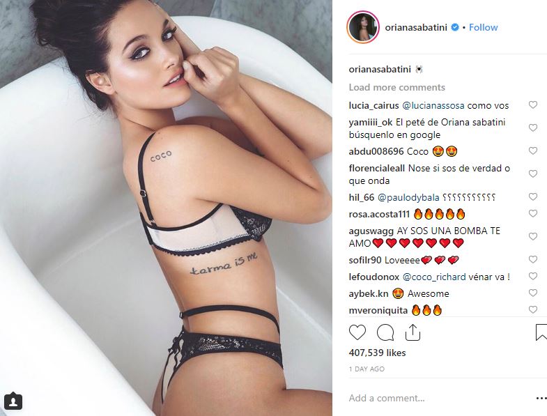 E dashura e Paulo Dybala ka pozuar në një vaskë me të brendshme teksa në pah kanë dalë tatuazhet e saj, një prej të cilëve shkruan “karma jam unë”.