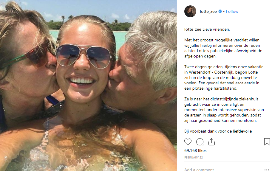 Lotte van der Zee nga Holanda ishte me pushime me prindërit e saj në Westendorf – Austri kur nisi të kishte shqetësime. Ajo ishte kurorëzuar si Miss Teen Universal në vitin 2017 dhe në 21 shkurt, një ditë para se të ndihej keq, mbushi 20 vjeç.