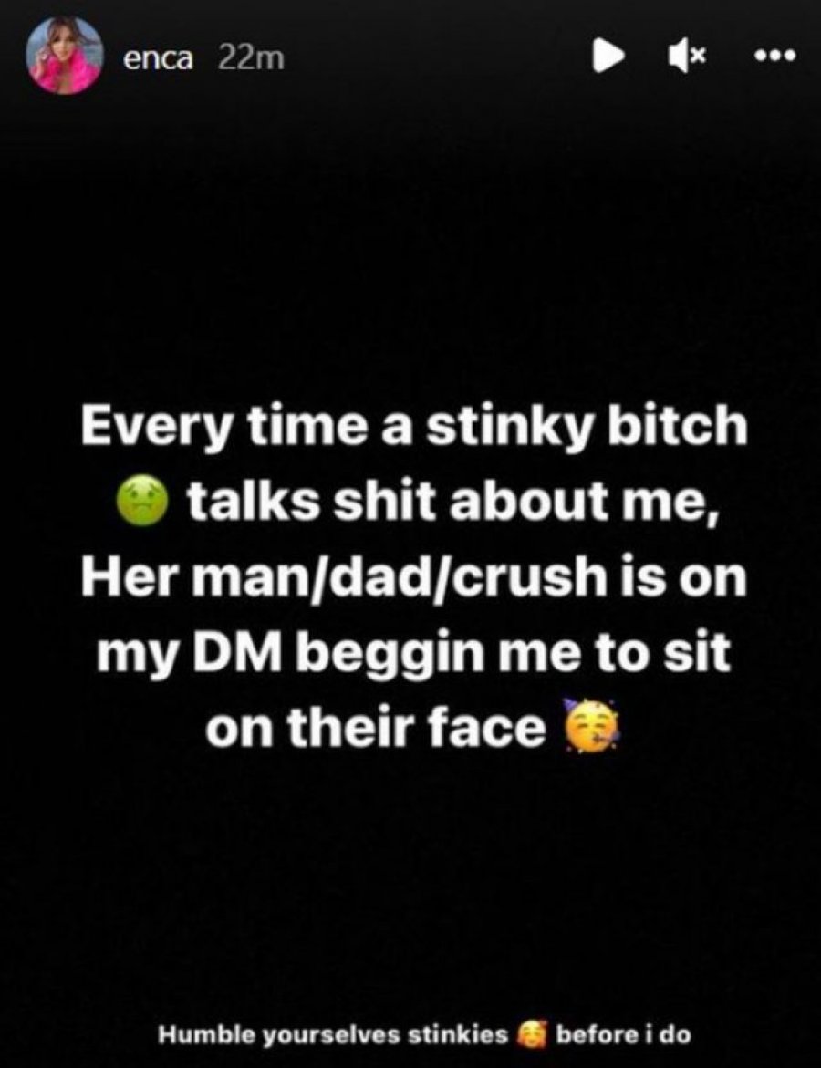 “Sa herë që një ku*vë e qelbur flet për mua, burri/dashnori/i dashuri i saj është në mesazhet e mia, duke mu lutur t’i ulem në fytyrën e tij. Përulni veten qelbësira, përpara se unë ta bëj”, shkruan Enca.