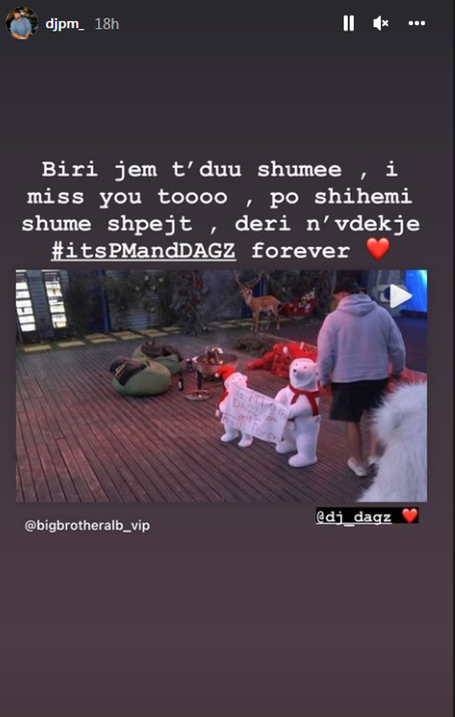 “Biri jem t’du shumë, i miss you too, po shihemi shumë shpejt. deri ne vdekje ItsPmtodheDagznow”, ka shkruar Dj PM në një postim në “Instastory”. Në këtë mënyrë ai tregoi se nuk i ka ngelur hatri me Dagz, por vetëm e mbështet.