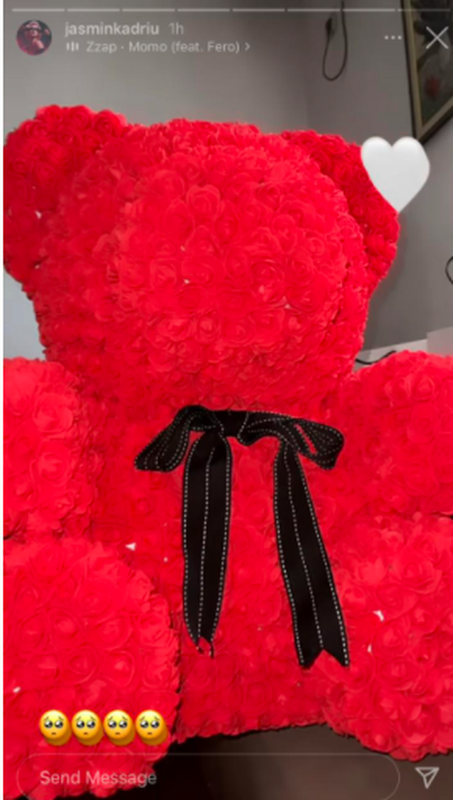 I dashuri i saj duket se i ka fiksim t’i bëjë dhuratë arusha Jasminës pasi pak kohë më parë ajo na zbuloi se mori po një arush dhuratë, por ndryshe nga këtë herë, ai ishte i kuq me trëndafila. Jasmina e shoqëroi videon me një zemër të bardhë.