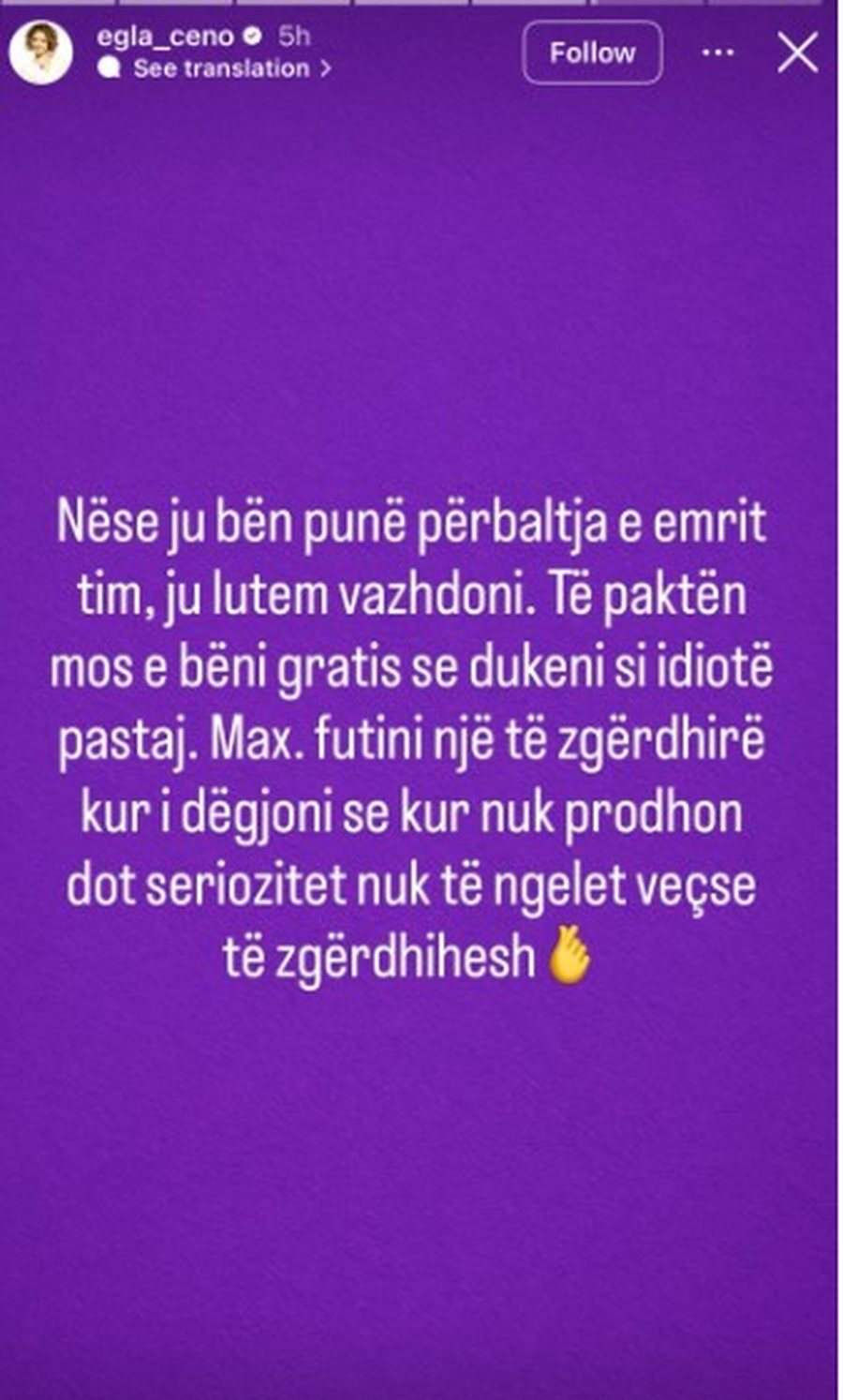Ajo shkroi: “Nëse ju bën punë përbaltja e emrit tim, ju lutem vazhdoni! Të paktën, mos e bëni gratis se dukeni si idiotë pastaj. Maksimumi, futini një të zgërdhirë kur i dëgjoni se kur nuk prodhon dot seriozitet, nuk të ngelet veçse të zgërdhihesh”.