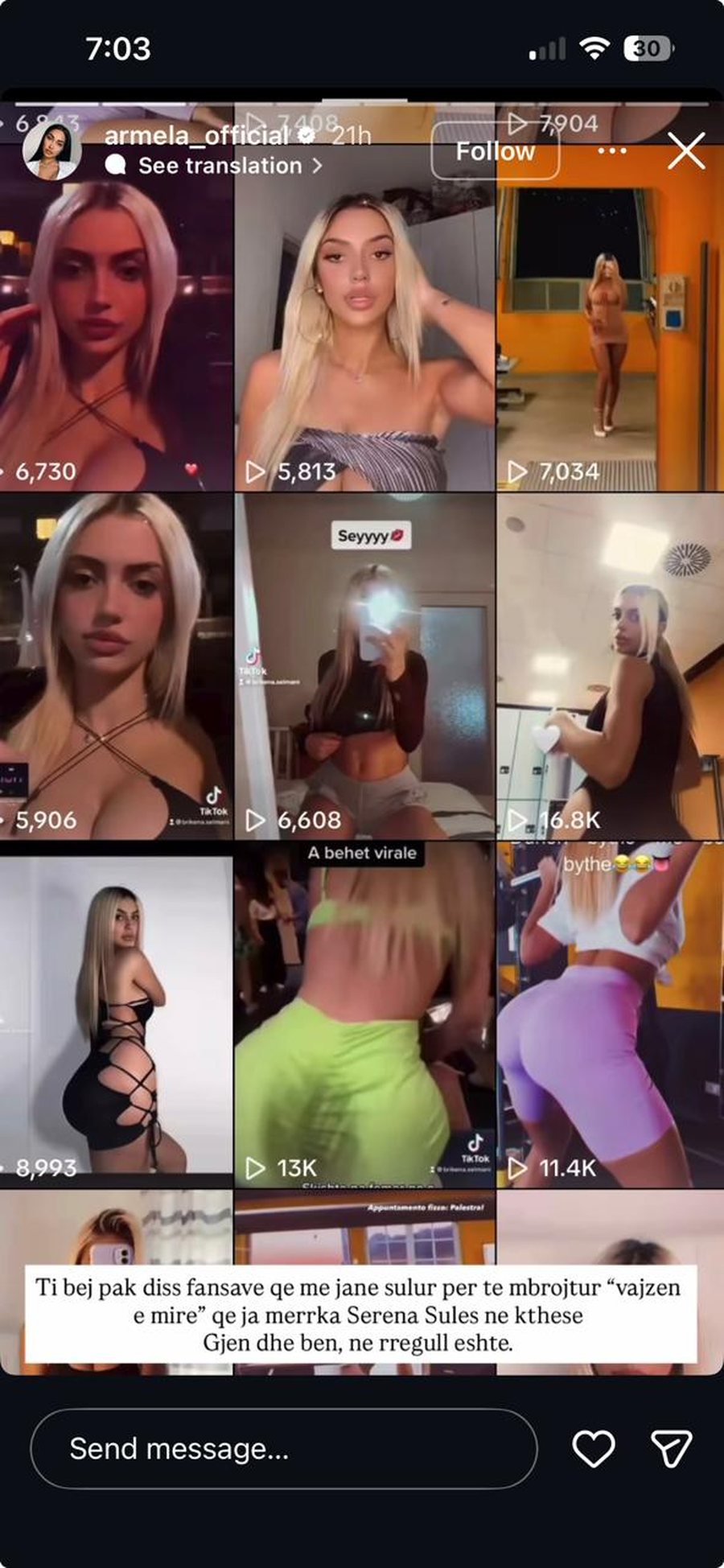 “Ti bej pak diss fansave qe me jane sulur per ta mbrojtur “vajzen e mire qe ja merrka Serena Sules ne kthese Gjen dhe ben, ne rregull eshte”, shkruan Armela në Instastory.
