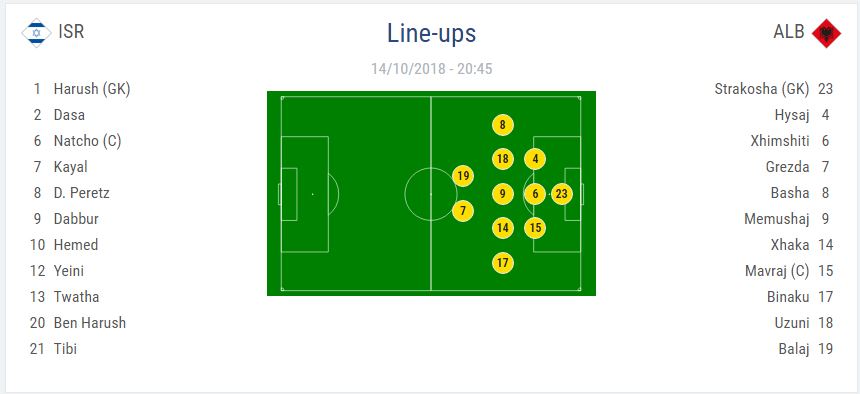 Shqipëria: Strakosha, Hysaj, Gjimshiti, Mavraj, Basha, Uzuni, Memushaj, Xhaka, Binaku, Balaj, Grezda. Trajner: Kristian Panucci.