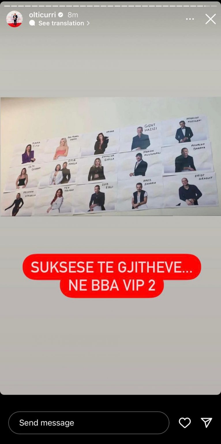 Opinionisti dhe gazetari i njohur Olti Curri ka publikuar listën e personazheve që do të marrin pjesë në Big Brother VIP Albania vetëm pak para fillimit të spektaklit. Ai ka publikuar foton e listës me emrat: Kiara Tito, Dea Mishel, Ariana,Gent Hazizi, Armaldo Kllogjeri, Keivina Kthella, Olta Gixhari, Efi dhe Mikela, Herieon Mustafaraj, Ronaldo Sharka, Krist Dragoti, Amos Zaharia, Luis Ejlli, Zhaklina Gjolla, Tea Trifoni.