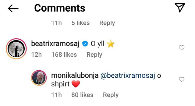 Teksa përballja e tyre nuk pati të papritura, ajo që ka surprizuar njerëzit ka qenë sërish Beatrix. Monika ka shpërndarë me ndjekësit e saj në Instagram dy foto nga karrigia e opinionistes teksa shkroi “Për’puthen”. Dhe Beatrix nuk ka ngurruar t’i komentojë duke i shkruar: “O yll”.