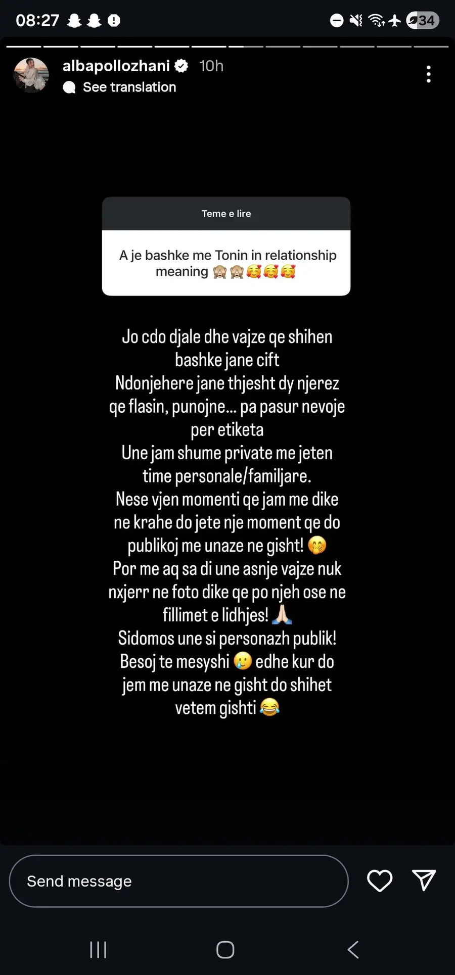Gjatë një bashkëbisedimi me ndjekësit në Instagram, ajo u pyet drejtpërdrejt mbi natyrën e marrëdhënies së tyre, duke i hedhur poshtë kategorikisht këto pretendime dhe duke theksuar se raporti mes tyre është vetëm miqësor dhe profesional.