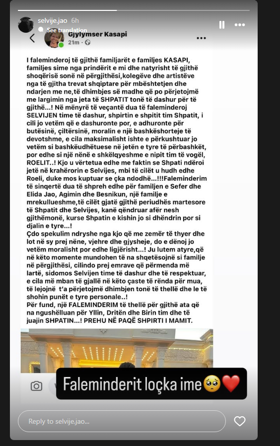 “I falënderoj të gjithë familjarët e familjes KASAPI, familjes sime nga prindërit e mi dhe natyrisht të gjithë shoqërisë sonë ne përgjithësi, kolegëve dhe artistëve nga te gjitha trevat shqiptare për mbështetjen dhe ndarjen me ne, të dhimbjes së madhe qe po përjetojmë me largimin nga jeta të SHPATIT tone të dashur për të gjithë…! Ne mënyrë të veçantë dua të falënderoj SELVIJEN time të dashur, shpirtin e shpitit tim Shpatit, i cili jo vetëm qe e dashuronte por, e adhuronte për butësinë, çiltërsinë, moralin e një bashkëshorteje të devotshme, e cila maksimalisht ishte e përkushtuar jo vetëm si bashkudhëtuese në jetën e tyre të përbashkët, por edhe si një nënë e shkëlqyeshme e nipit tim te vogël, ROELIT..! Kjo u vërtetua edhe me faktin se Shpati ndërroi jetë në kraharorin e Selvijes, mbi të cilët u hodh edhe Roeli, duke mos kuptuar se çka ndodhë…!!! Falënderim të sinqertë dua të shpreh edhe për familjen e Sefer dhe Elida Jao, Agimin dhe Besnikun, një familje e mrekullueshme, te cilët gjatë gjithë periudhës martesore të Shpatit dhe Selvijes, kanë qëndruar afër nesh gjithmonë, kurse Shpatin e kishin jo si dhëndrin por si djalin e tyre…! Çdo spekulim ndryshe nga kjo që me zemër të thyer dhe lot në sy prej nëne, vjehrre dhe gjysheje, do e dënoj jo vetëm moralisht por edhe ligjërisht…! Ju lutem atyre, që në këto momente mundohen të na shqetësojnë si familje në përgjithësi, cilindo prej emrave që përmenda më lartë, sidomos Selvijen time të dashur dhe të respektuar, e cila më mban të gjallë ne këto çaste të rënda për mua, të lejojnë t’a përjetojmë dhimbjen tonë të thellë dhe le të shohin punët e tyre personale..! Për fund, një FALEMINDERIM të thellë për gjithë ata qe na ngushëlluan për Yllin, Dritën dhe Birin tim dhe të tuajin SHPATIN…! PREHU NË PAQË SHPIRTI I MAMIT”, ka shkruar Kasapi.