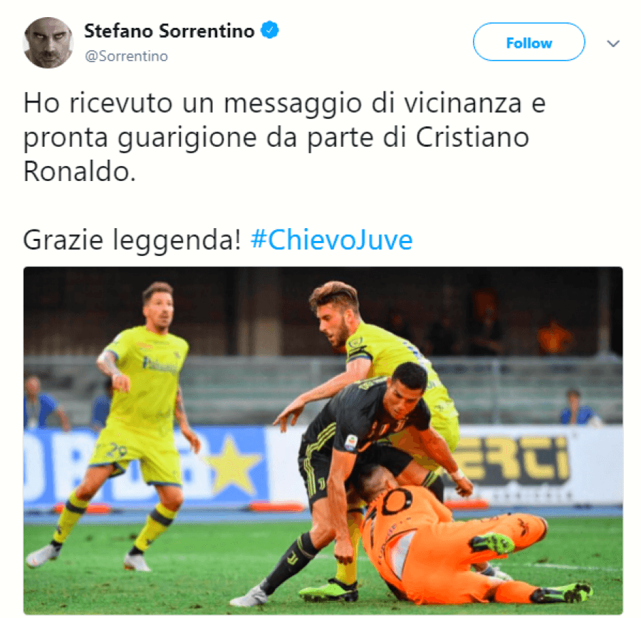 “Kam marrë një mesazh nga Ronaldo që më ka dëshiruar shërim të shpejtë. Faleminderit legjendë”, shkroi Sorrentino.