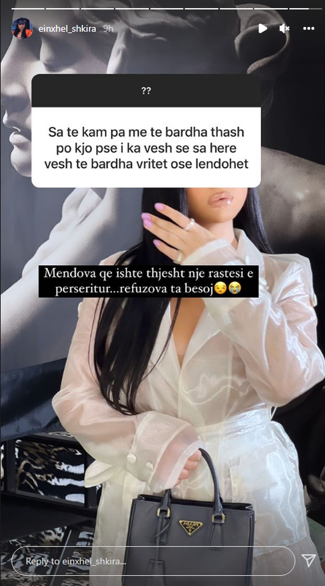 Ende pa marrë veten nga incidenti që i ndodhi brenda shtëpisë së “Big Brother VIP”, ku theu krahun keq, Einxhel Shkirës i ka ndodhur një tjetër incident. Këtë e ka zbuluar vetë moderatorja e njohur përmes një postimi në rrjetet sociale. Dhe këtë gjë ajo e lidh me ngjyrën e bardhë në vesh për të cilën thotë se nuk is jell fat të mirë.