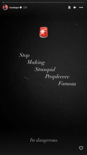 “Ndaloni së bëri të famshëm njerëzit budallenj. Është e rrezikshme”, ka shkruar Capital T, në Instastory-n e tij. Për sa kohë ky thumb nuk ka një adresë, atëherë mund të jetë për këdo, përfshirë edhe kolegët e tij të showbiz-it.