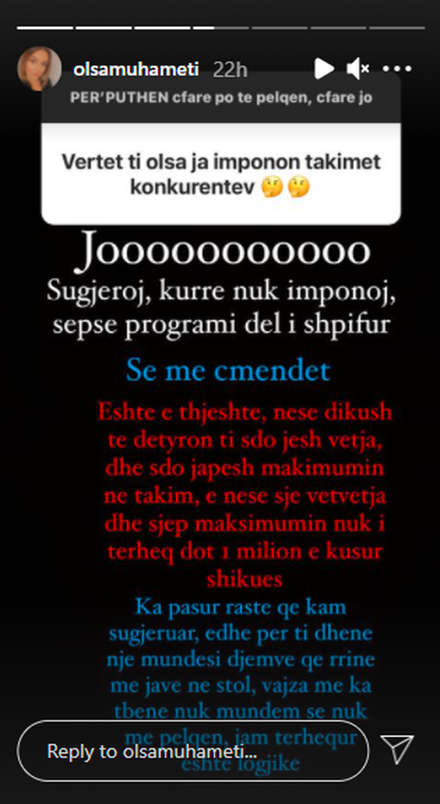 Autorja e “Përputhen”, Olsa Muhameti ka bërë së fundmi një bisedë virtuale me ndjekësit në rrjete sociale, ku është pyetur nëse ajo ua imponon takimet konkurrentëve. Olsa e ka mohuar, duke thënë se ajo vetëm iu jep sugjerime, por nuk i detyron të dalin nga vetja.