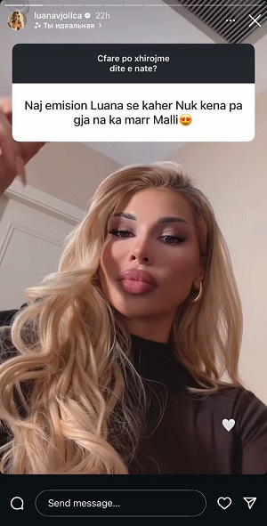 Së fundmi, në profilin e saj në Instagram, Luana ka ndarë disa momente nga prapaskenat, ku shihet duke punuar deri në orët e para të mëngjesit, gjë që e ka çuar ta quajë veten “robot” sesi mund të fuksionojë pa gjumë. Pamjet e postuara krijojnë përshtypjen se moderatorja ndodhet në një set xhirimi, duke forcuar dyshimet se ajo mund të jetë pjesë e një projekti filmik.