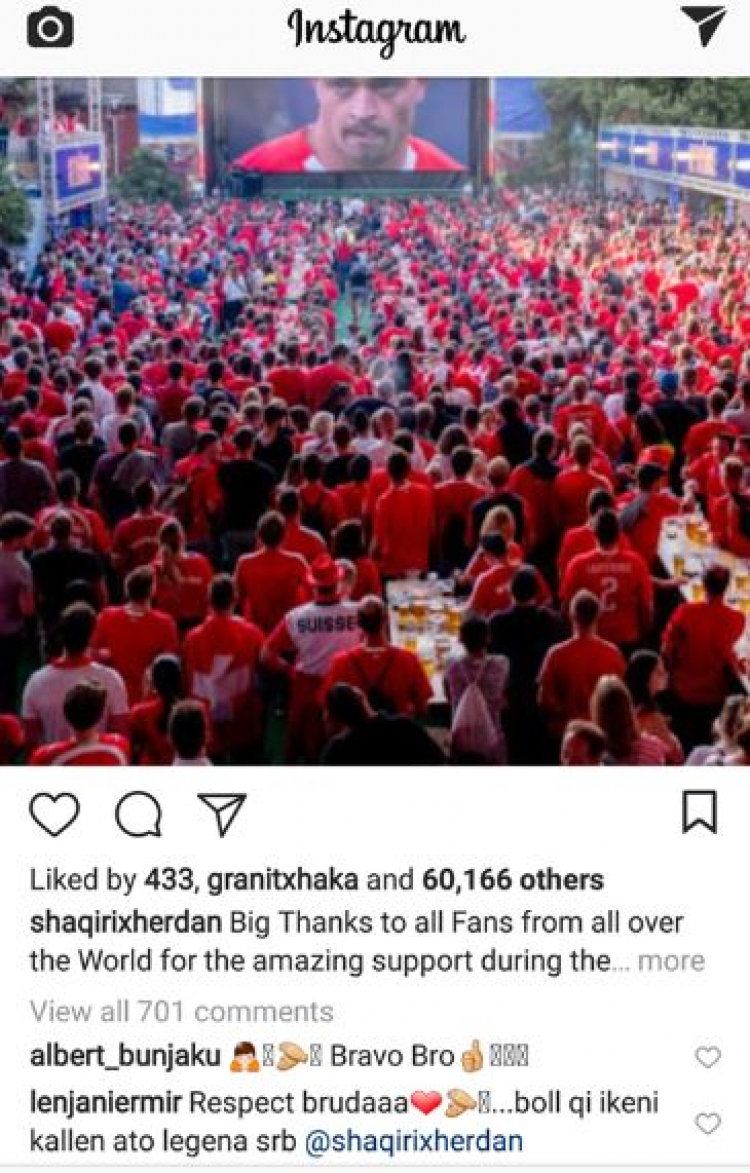 Ylli i Zvicrës, Xherdan Shaqiri, postoi ditën e sotme një foto të tifozëve zviceranën, të cilët ishin mbledhur në shesh për të parë ndeshjen dhe për të mbështetur vendin e tyre.