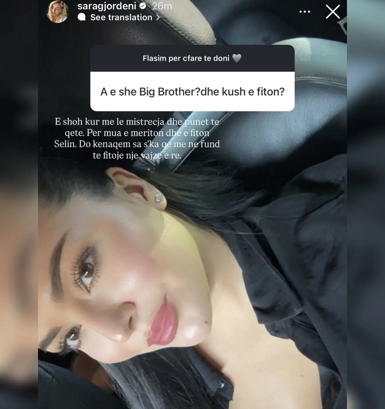 Përmes një pyetjeje të drejtpërdrejtë në “Instagram”, Sara u pyet nëse e ndjek programin dhe kush mendon se do të shpallet fitues. Ajo u shpreh se nuk ka mundësi ta ndjekë rregullisht për shkak të angazhimeve të saj, por megjithatë ka një mendim të qartë për një nga banoret.