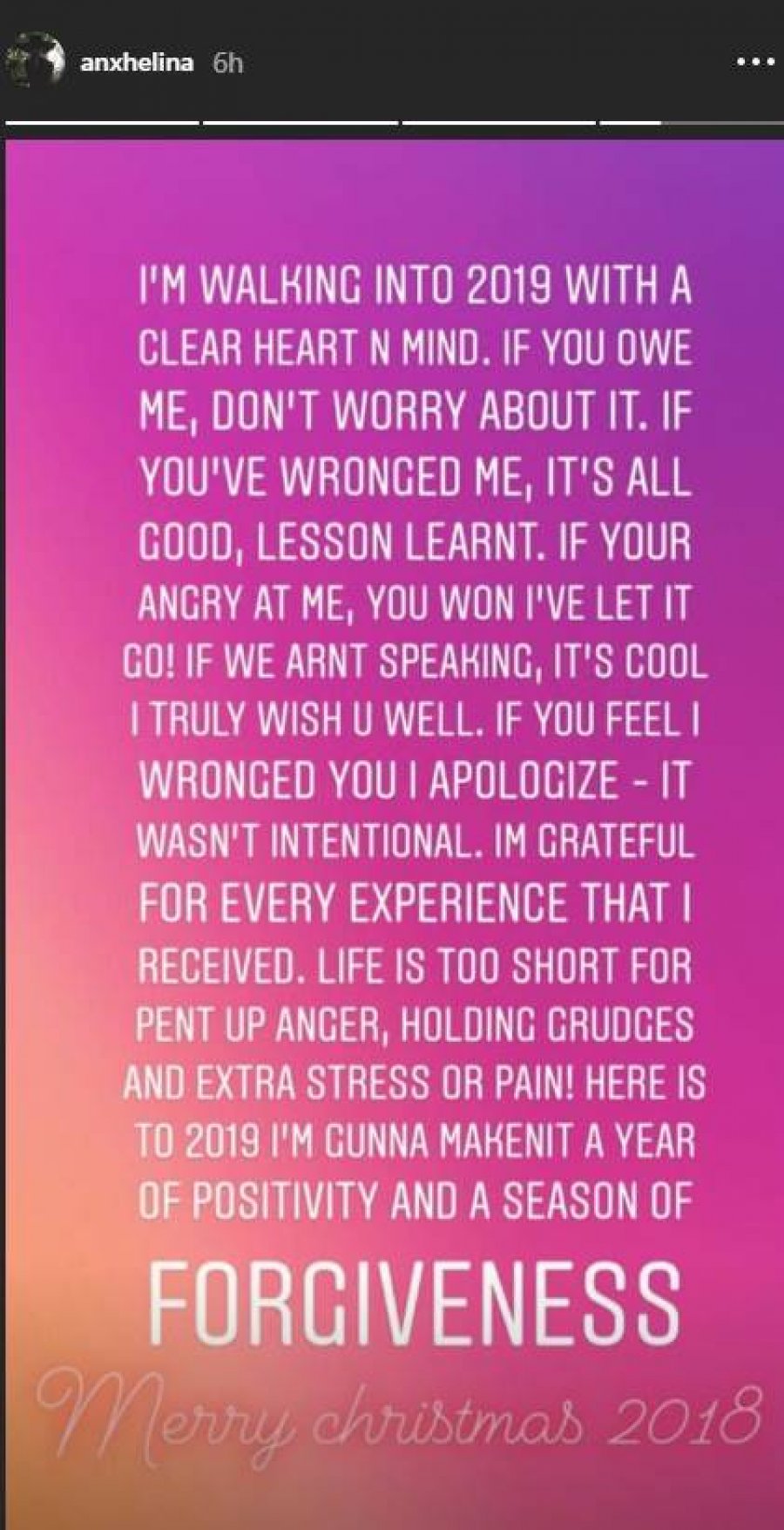 “Po eci në 2019-n me zemër dhe mendje të pastër. Nëse më ke borxh mos u shqetëso. nëse ke gabuar me mua është gjithçka në rregull, e mësove leksionin. Nëse je i inatosur me mua, ke fituar, mua më kaloi. nëse nuk flasim, të uroj gjithë të mirat. Nëse ndihesh se kam gabuar me ty, kërkoj ndjesë, ishte e paqëllimshme. Jam mirënjohëse për çdo eksperiencë që kam kaluar. Jeta është shumë e shkurtër për tu kapur pas inatit, zilisë, dhe stresit të tepërt ose dhimbjes. Një dolli për 2019-n, do ta bëj një vit pozitiviteti dhe një sezon faljeje” ka shkruar Anxhelina në postimin e saj.