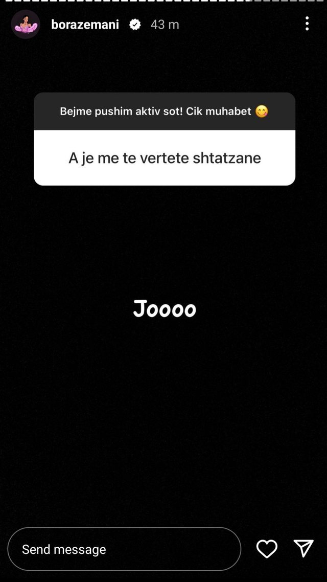 Bora Zemani është përfolur përgjatë javëve të fundit për një shtatzëni të mundshme, pasi parashikuesja e fatit që kishte deklaruar se ajo do të ribashkohej me Donaldin tha në media se moderatorja është në pritje të një djali. Ditën e sotme ajo ka realizuar një pyetësor me ndjekësit e saj në Instagram dhe nuk kishte si të mungonte një pyetje në lidhje me këtë gjë.