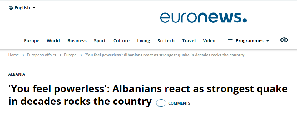 Euronews në titull kryesor të lajmit shkruan: “Shqiptarët reagojnë ndaj tërmetit më të fuqishëm në dekadat e fundit”