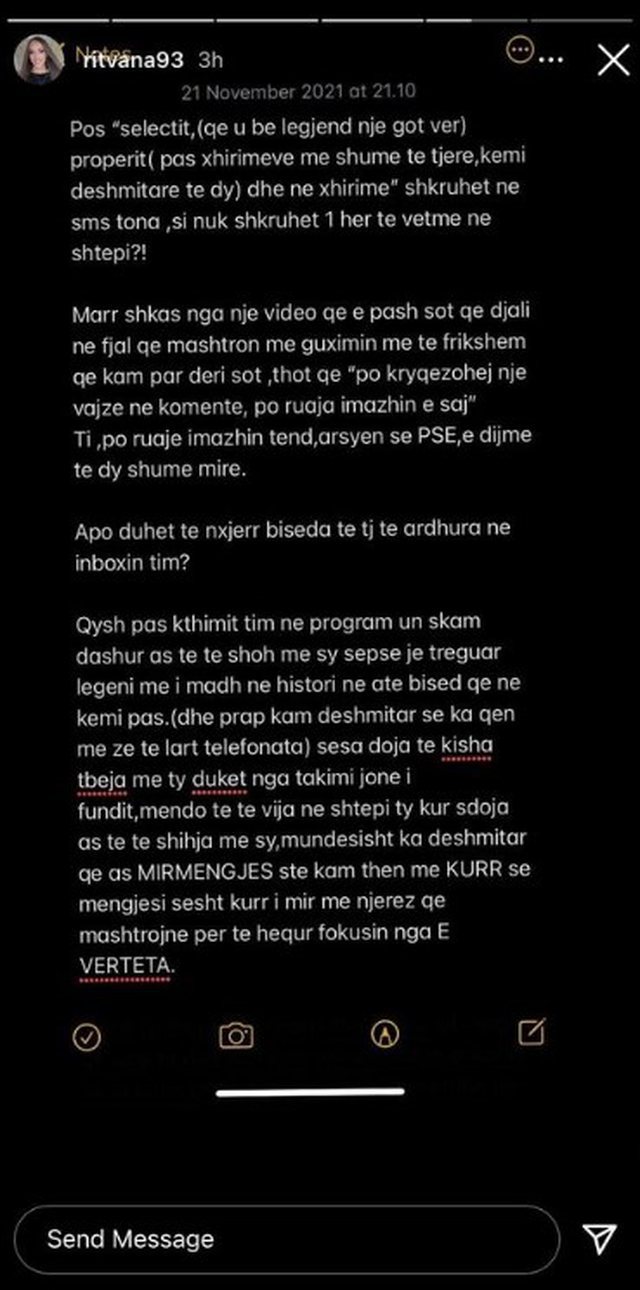"Djali në fjalë që mashtron me guximin më të frikshëm që kam parë deri sot, thotë që 'po kryqëzohej një vajzë në komente, po ruaja imazhin e saj', ti po ruaje imazhin tënd, arsyen pse e dimë të dy shumë mirë. Apo duhet të nxjerr biseda të tjera të ardhura në inboxin tim? Qysh pas kthimit tim në program, unë s'kam dashur as të të shoh me sy sepse je treguar legeni më i madh në histori në atë bisedë që ne kemi pas (dhe prapë kam dëshmitar se ka qenë me zë të lartë telefonata) sesa doja të kisha t'bëja me ty duket nga takimi ynë i fundit, mendo të të vija në shtëpi ty kur s'doja as të të shihja me sy, mundësisht ka dëshmitar që as mirëmëngjes s'të kam thënë më kurrë se mëngjesi s'është kurrë i mirë me njerëz që mashtrojnë për të hequr fokusin nga e vërteta", shkruan Ritvana.