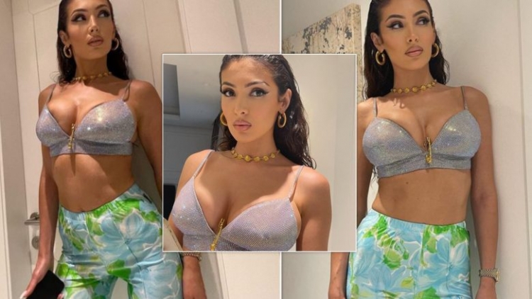 Ajo shfaqet me një fustan ngjyrë të zi shumë të shkurtër dhe që i nxjerr barkun jashtë.