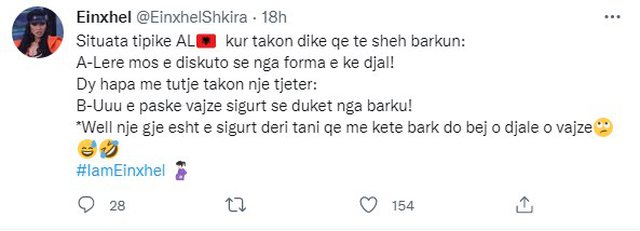 “Situata tipike shqiptare kur takon dikë që të sheh barkun. Lëre mos e diskuto se nga forma e ke djalë. Dy hapa më tutje takon një tjetër. Uuuu e paske vajzë sigurt se duket nga barku. Mirë, një gjë është e sigurt deri tani që me këtë barkë do bëj o djalë o vajzë”, ka shkruar Einxhel.